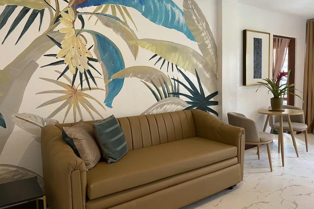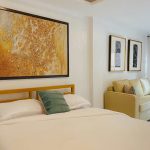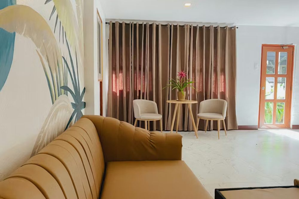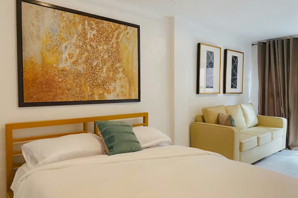 Living room with sofa and pullout bed, bedroom with queen size bed and sofa. Good for 2. Can accommodate up to 4 pax. Breakfast not included.